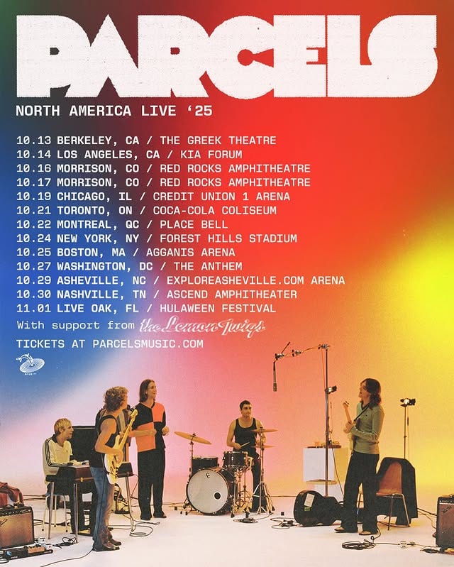 Parcels begin their 2025 tour this week with a show in Berkeley, then will make their way to the Los Angeles area on Tuesday, October 14 for a show at the Kia Forum. The electropop group is celebrating their latest release, LOVED, with rockers The Lemon Twigs along as support.
